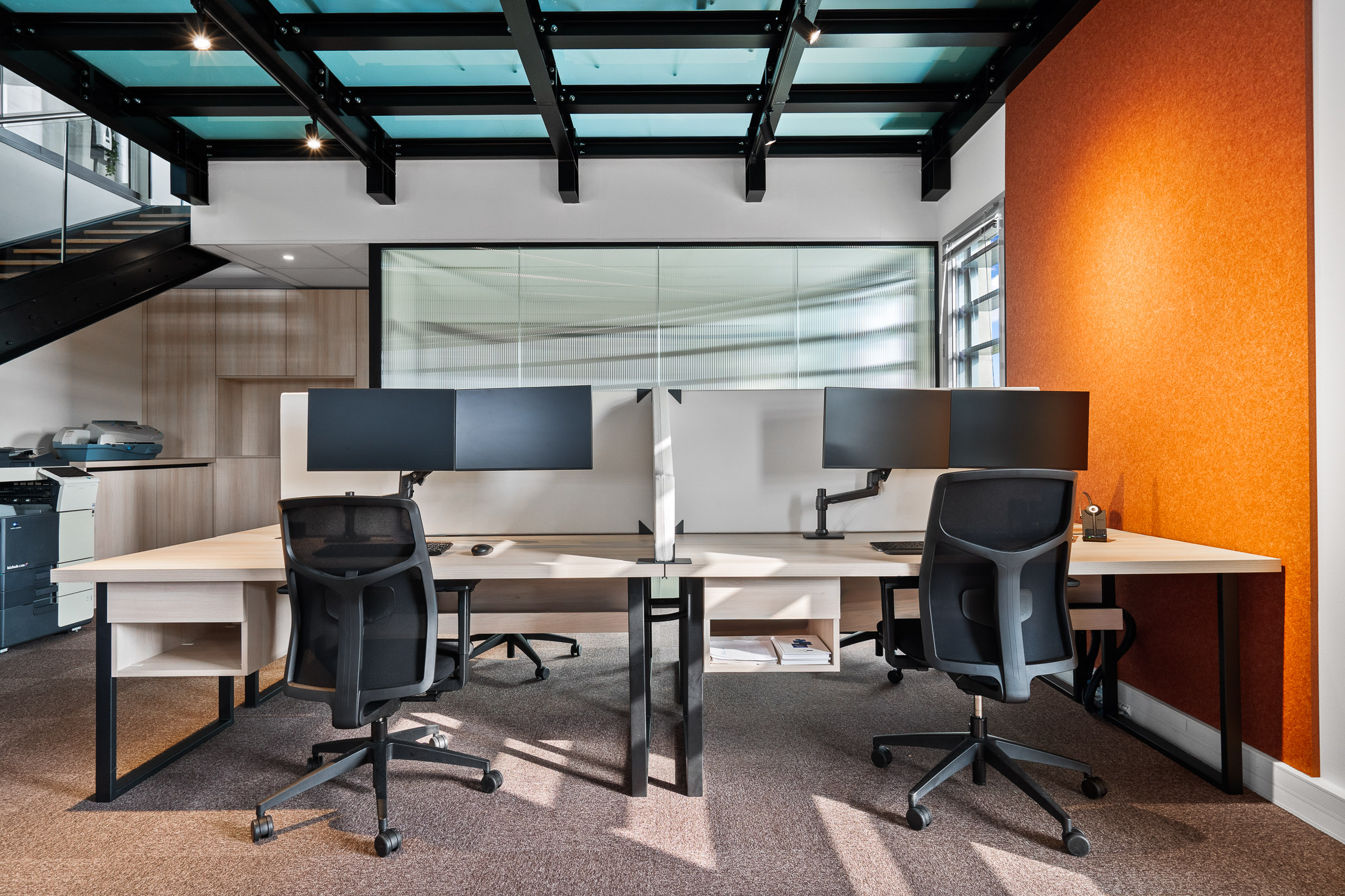 L’ensemble du plateau a été optimisé : traitement acoustique avec cloisonnettes, mobilier sur mesure (bureaux, cuisine), circulation fluide. La bande orange, fil conducteur du projet, assure une continuité visuelle entre les deux niveaux et structure l’espace avec justesse.