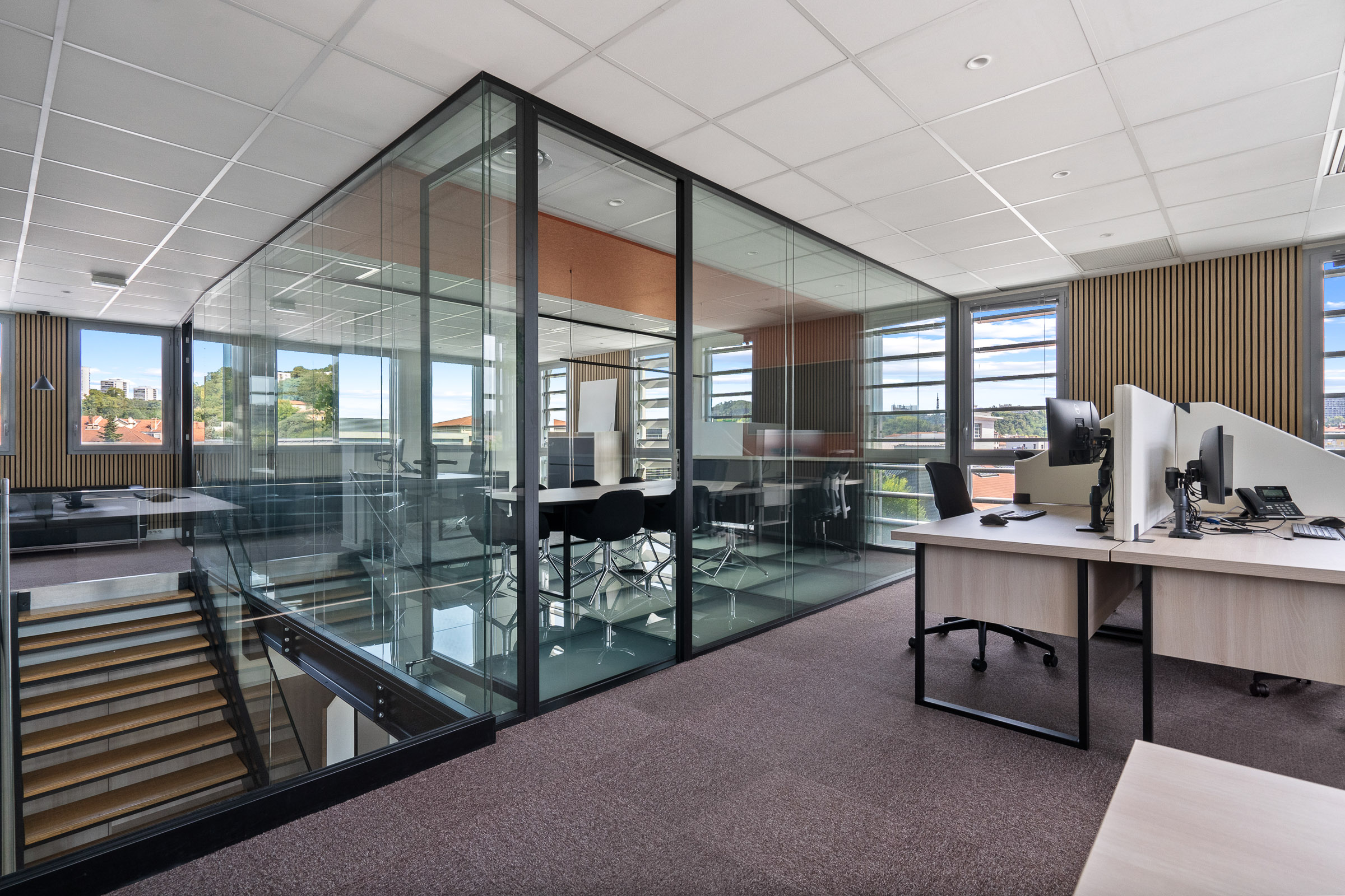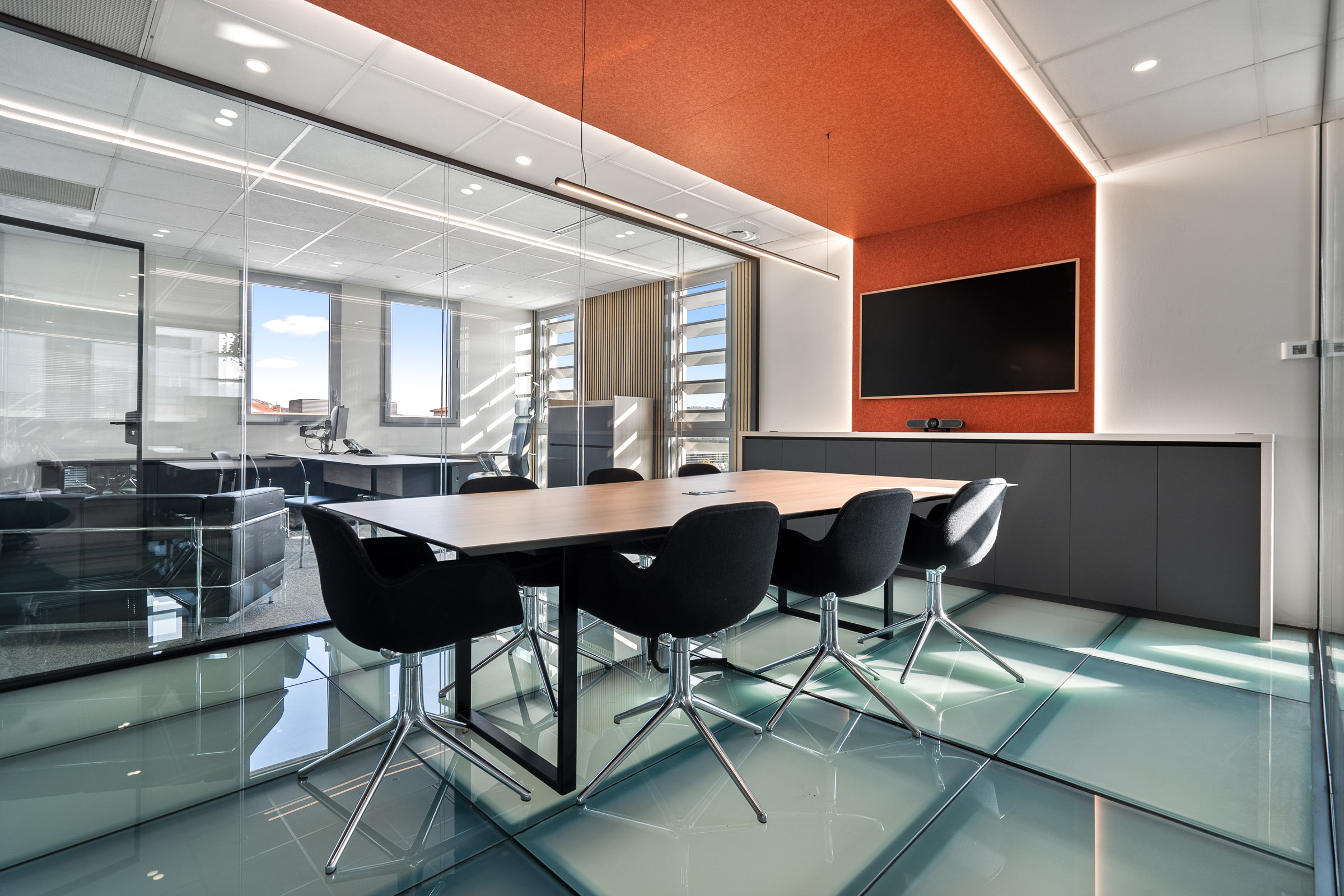 Pour la rénovation de ces bureaux, le projet s’est articulé autour de deux éléments forts : une salle de réunion vitrée et suspendue sur structure métallique, traversée par des dalles de verre et un open space lumineux traité dans sa globalité.