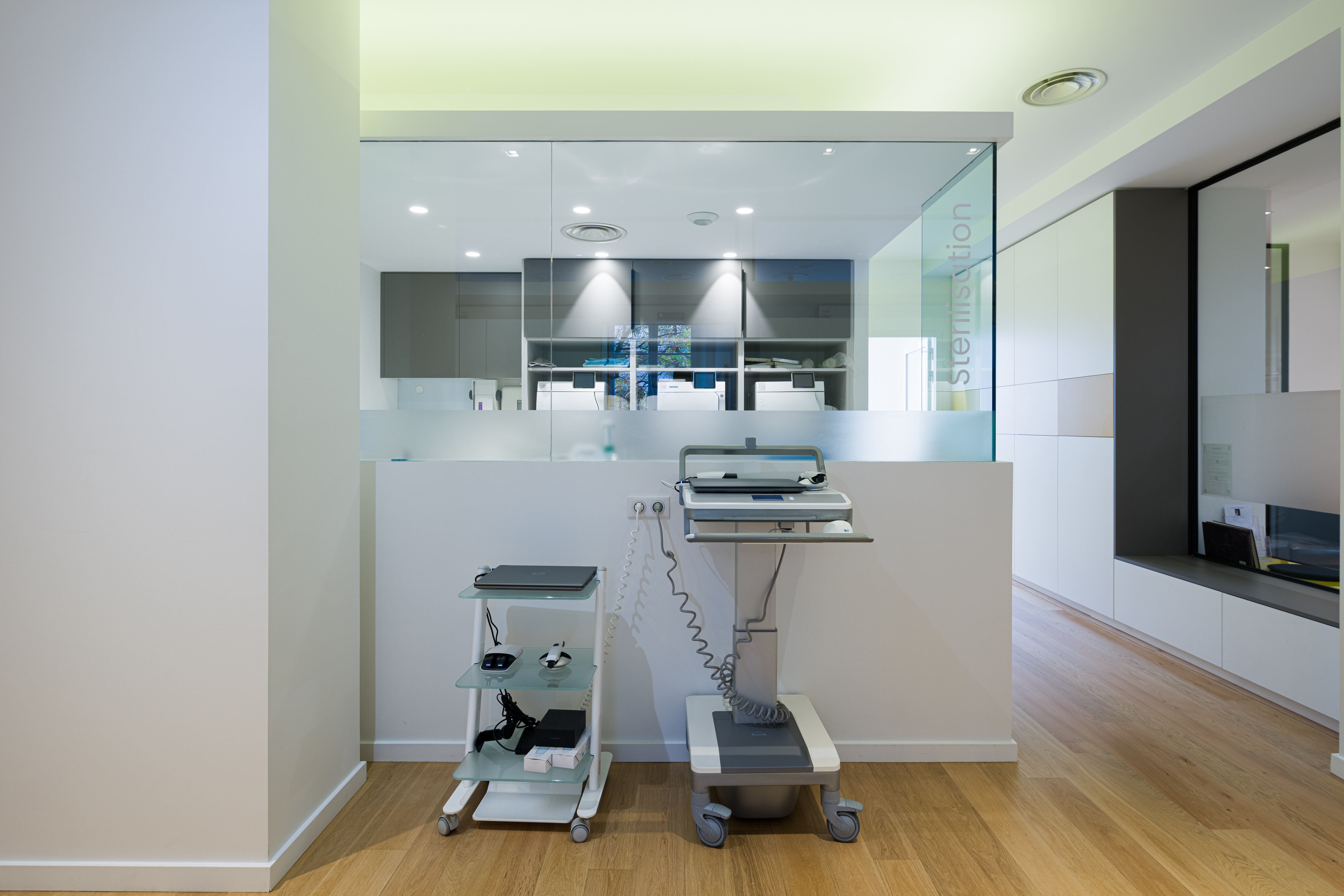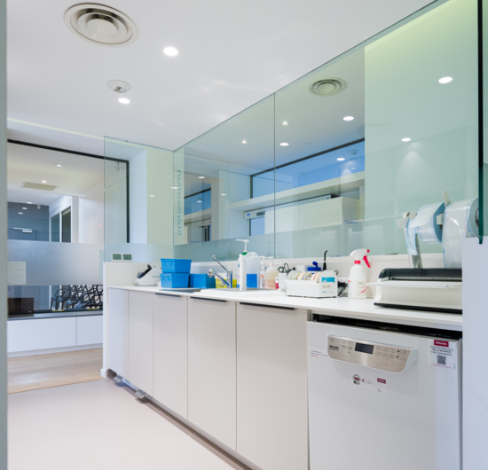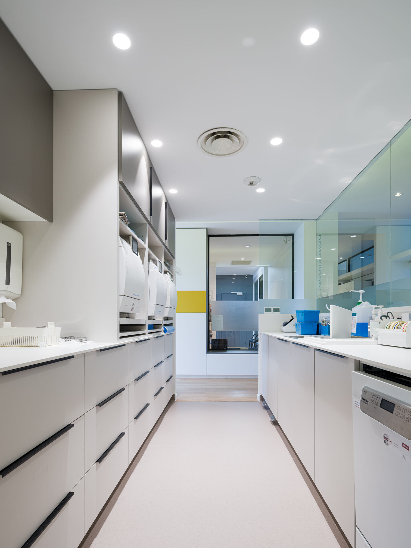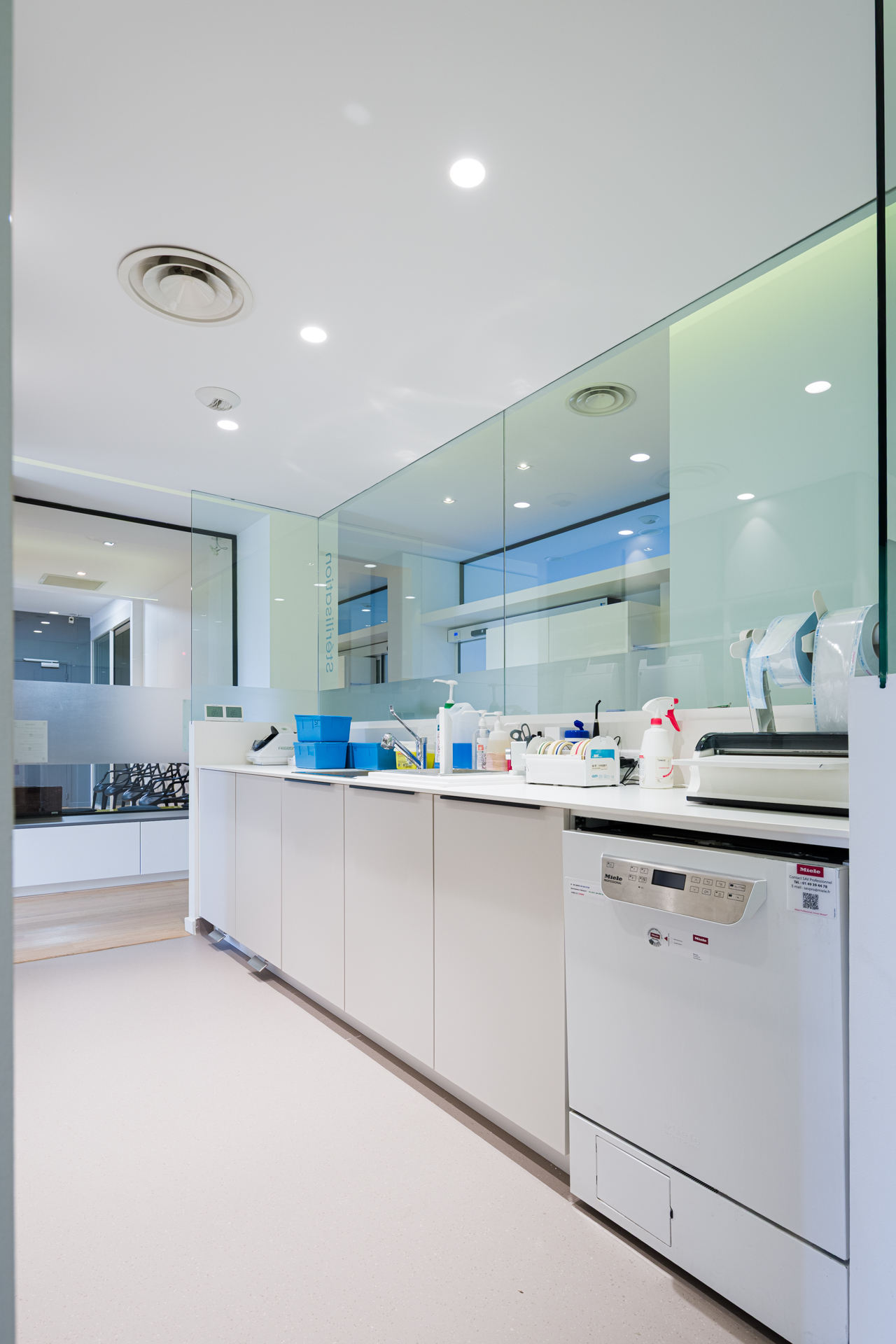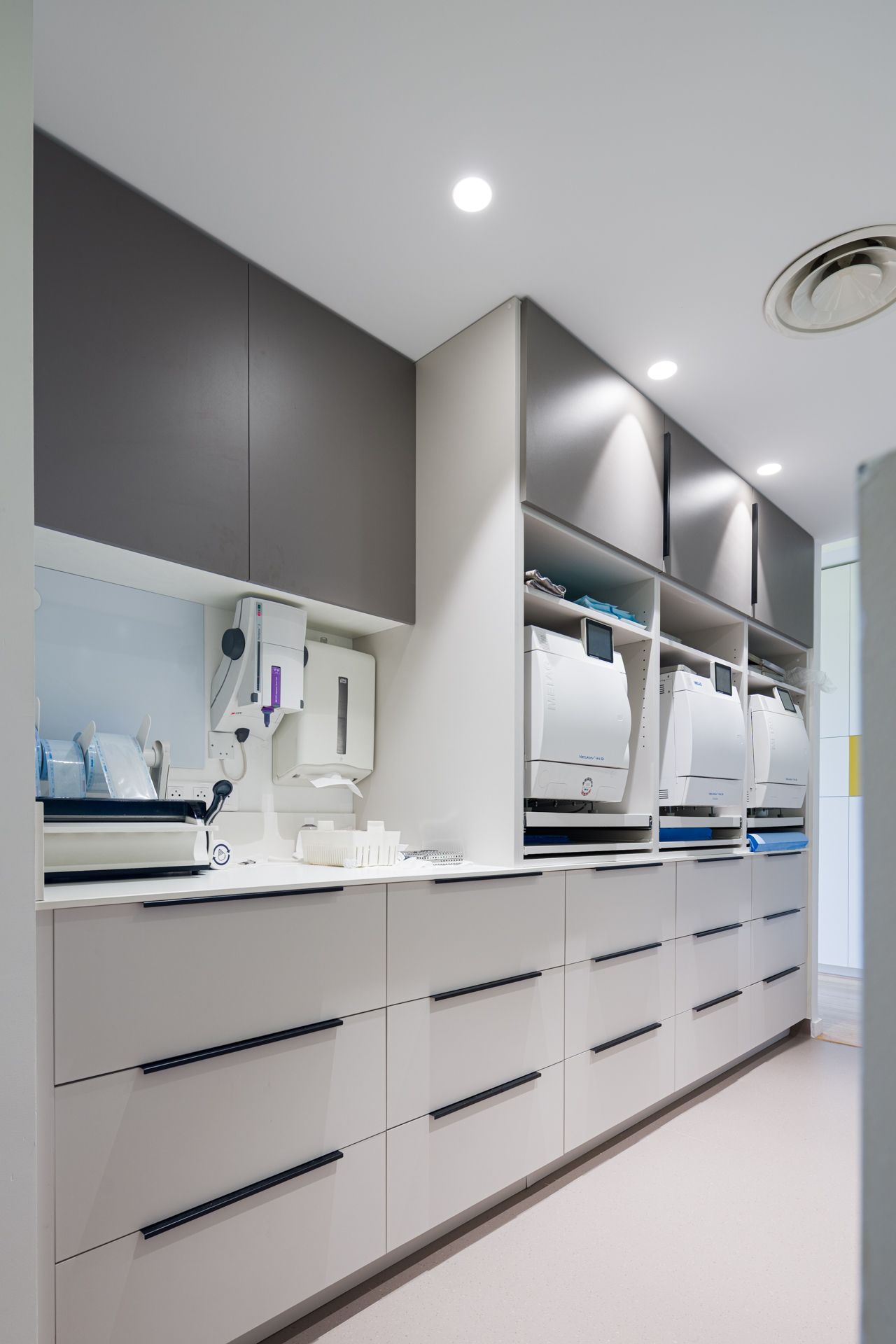 Nous avons ainsi créés un bureau et d’une salle de soins adaptés à chaque praticien. Un espace dédié à la chirurgie a été aménagé, comprenant un box de repos, une zone de stérilisation ainsi qu’un sas de préparation.