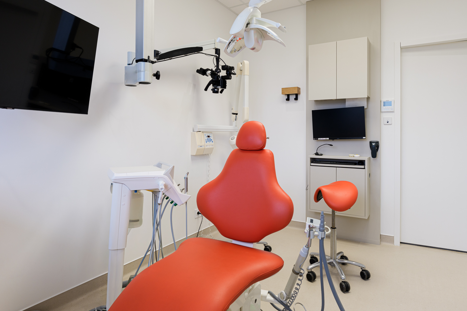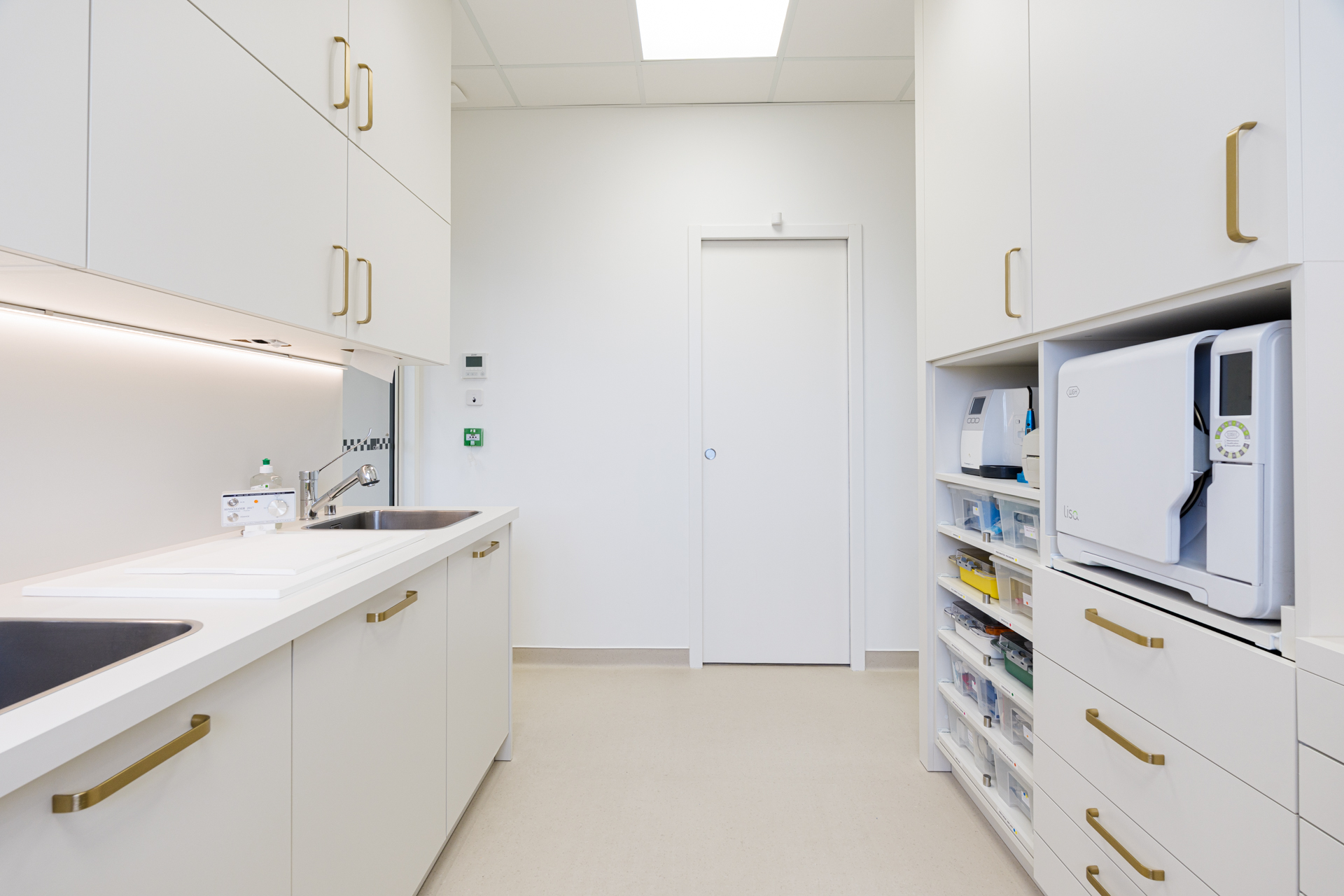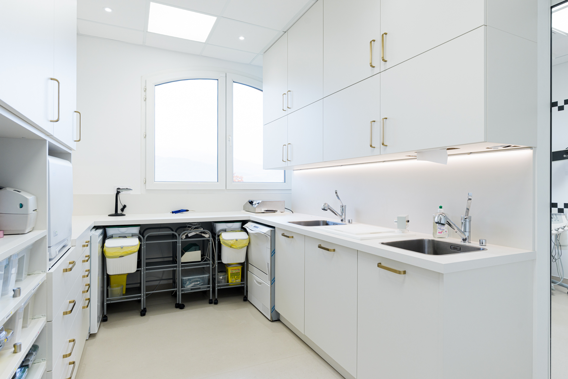 L’aménagement a quant à lui été conçu pour le confort du praticien et l’évolution de la pratique, notamment grâce à du mobilier sur roulettes pour plus de flexibilité.